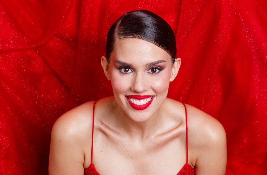 Kosa joj je podignuta u artističku punđu ukrašenu metalom, a nosi i vrlo upečatljivi make-up s kojeg je teško skrenuti pogled.